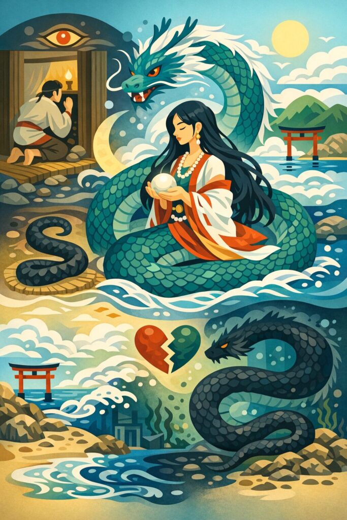 豊玉姫は、海神の娘として生まれ、龍蛇の本質を宿す水の女神であり、皇統へとつながる“海の母”として重要な役割を果たす存在です。